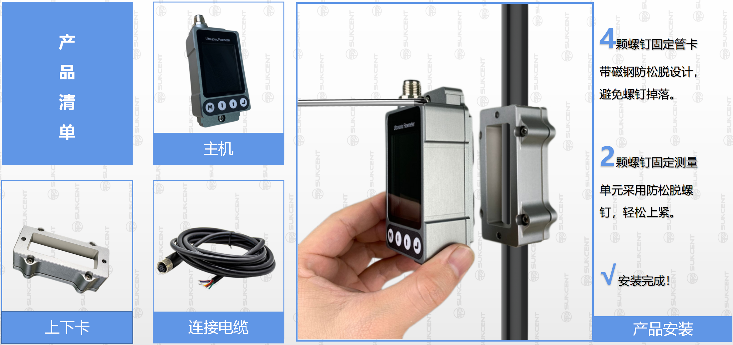 X5具有操作簡易、外觀精致的特點。首先,X5在結構設計上使用了圓形磁鋼,實現安裝時自動卡合,從安裝到測量,只需2-3分鐘即可完成。其次,X5應用目前世界先進的時間測量芯片,時間分辨率達到50ps,更是采用目前流行的IPS LCD顯示屏,在光線不足的環境下也能實現輕松讀數,同時還有全新的流量波形圖示。最后,選單結構簡單,操作者通過4個按鍵可輕松設置或修改參數。